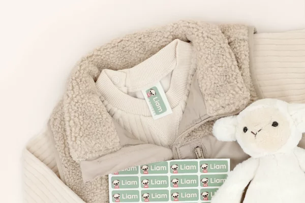 Det enklaste sättet att märka kläder till förskolan eller skolan är att använda våra självhäftande namnlappar. Du fäster dem direkt på tvättinstruktionen i plagget – du behöver inte stryka eller sy på dem.